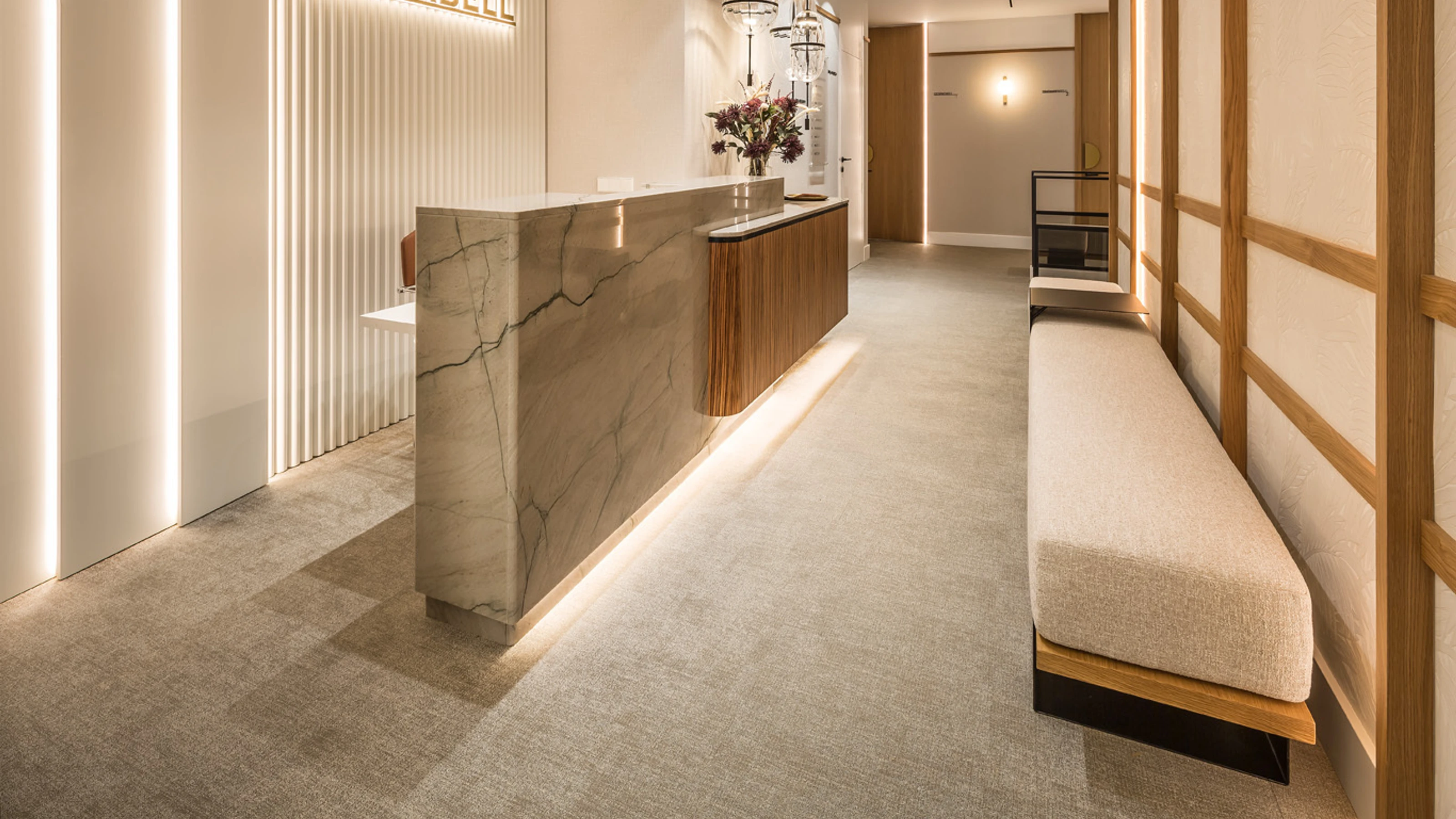 Unsere Böden sind resistent gegen Desinfektionsmittel, was im Gesundheitswesen unerlässlich ist. Die Farbintensität des Garns wird auch nach Jahren der Pflege nicht beeinträchtigt.