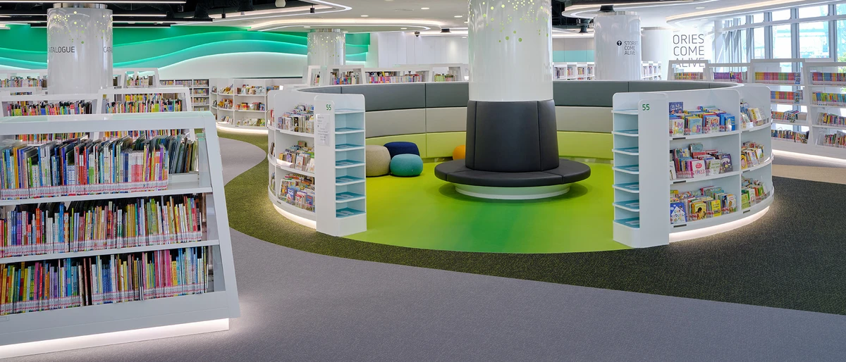 Zee Choing, architetto del premiato studio di architettura Metaphor Design + Architecture, ha utilizzato questo luogo unico – vicino al mare – come ispirazione per il design. Il tema della costa è visibile in tutta la biblioteca. I soffitti ondulati, i pavimenti sinuosi e i mobili contorti – tutti in palette cromatiche fuse – fanno risaltare questo design costiero. Il tutto è facilmente realizzabile tagliando le piastrelle e collocandole in una struttura di design ondulato e costiero. In effetti, qualsiasi design può essere installato senza sforzo grazie alla continuità di 2TEC2. I diversi colori definiscono tutti i reparti e indicano le zone di camminata. Per creare un luogo di alto livello e soddisfare le esigenze di una biblioteca, la pavimentazione vinilica tessuta 2TEC2 offre un’acustica eccellente grazie allo strato inferiore SonoFelt.