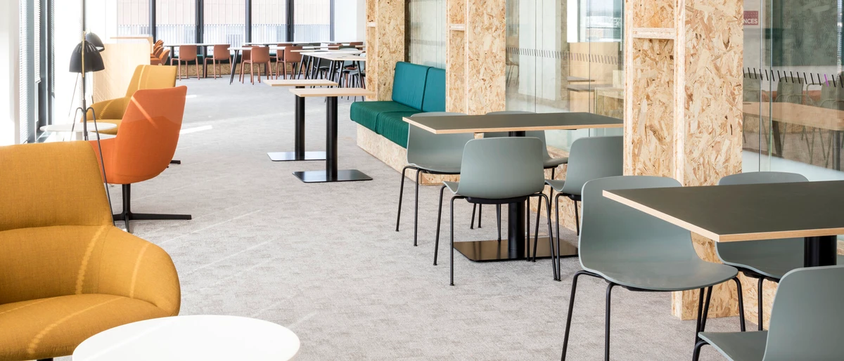 Lo studio di architettura Studios Architecture ha optato per 4.000 m² di piastrelle Helios per questo coloratissimo ufficio. Studios era alla ricerca di un tipo specifico di pavimentazione con buone prestazioni acustiche, una bella texture e una facile manutenzione. Non volevano utilizzare piastrelle di moquette perché questo tipo di pavimentazione cattura troppa polvere e conferisce un aspetto antiquato allo spazio.